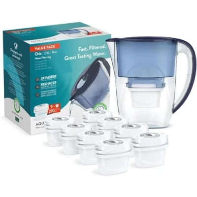 Aqua Optima PJ0614 Oria Water Filter Jug & 9 x 30 Day Evolve+ Cartridge, 2.8 Litre Capacity, for Reduction of Microplastics, Chlorine, Limescale and Impurities, Blue