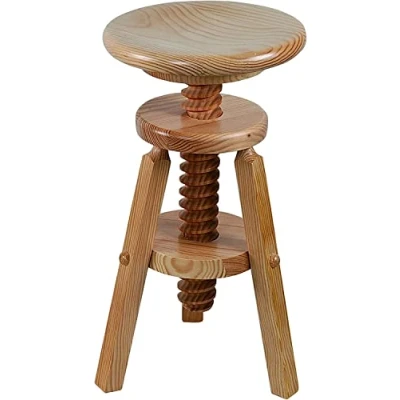 Stool made of pine wood. Very strong and durable. Adjustable in height thanks to its swivel seat. Varnish finish. Measurements: 29 cm (diameter seat) x 48-64 cm