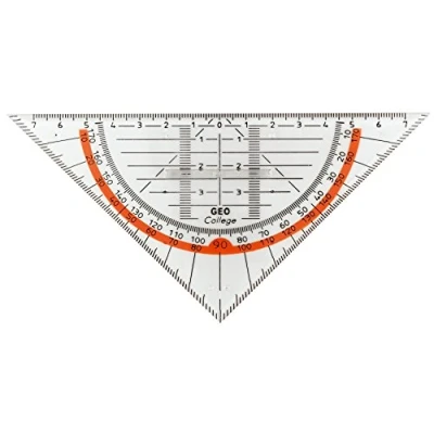 The college geometry triangle with a hypotenuse of 16 cm is scale, protractor, symmetry scale and parallel ruler in one and therefore can be used in school, study and work It has facets on all sides. These bevels on the edge of the triangle are used for exact pen guidance and ensure a precise stroke The set square has ink nubs. These ensure a distance of the triangle from the paper. This prevents ink smearing and protects the division from wear. The divisions, symbols and the lettering are applied on the back. The angle scale is orange background and thus forms a good contrast to the paper Box contents: 1 x AR23003 angle triangle made of transparent polystyrene plastic with firm grip that makes it easier to use