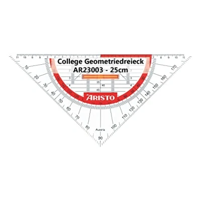 The college geometry triangle with a hypotenuse of 16 cm is scale, protractor, symmetry scale and parallel ruler in one and therefore can be used in school, study and work It has facets on all sides. These bevels on the edge of the triangle are used for exact pen guidance and ensure a precise stroke The set square has ink nubs. These ensure a distance of the triangle from the paper. This prevents ink smearing and protects the division from wear. The divisions, symbols and the lettering are applied on the back. The angle scale is orange background and thus forms a good contrast to the paper Box contents: 1x AR23008 angle triangle made of transparent polystyrene plastic with removable handle that makes it easier to use