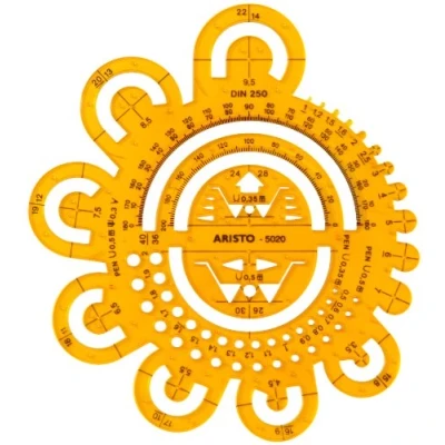 An irreplaceable tool for training, teaching in technical drawing or the architectural office: easy and quick circles without compass Rounding template with radii from 0.5 mm to 40 mm with centre hole for accurate construction, axle embossing, circular rods and protractor 180° and 200° Clean work on building plans or technical drawings thanks to ink nubs Rounding radii according to DIN 250 standard, symbols according to DIN ISO 1302 standard The stencil comes in a handy plastic sleeve. Format of the drawing template: 162 x 162 x 1.5 mm