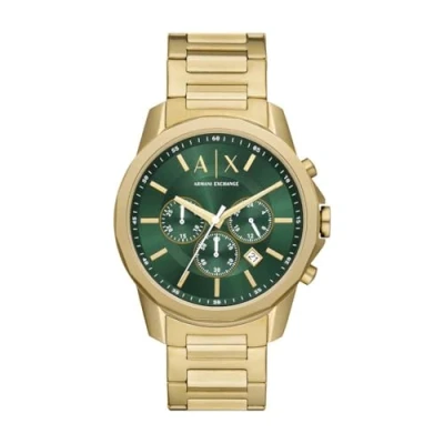 44mm case, 22mm band width, mineral crystal, Quartz movement with chronograph analog display, imported. Round stainless steel case, with a green dial. Gold, stainless steel bracelet. Water resistant up to 50m: Wearable while swimming in shallow water.