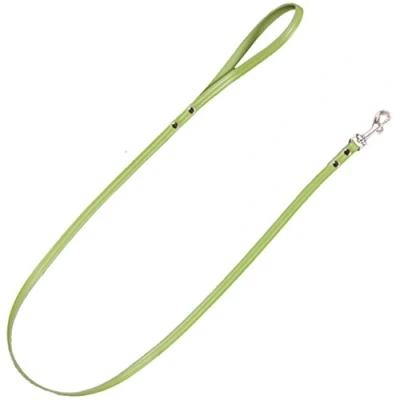 Leather cowhide leather in green carabiner hook and riveted handle, dimensions: length approx. 100 cm, width: 1 cm Ideal for hiking with your pet, shoulder strap, durable and very skin-friendly. Recommended for small and medium breed dogs Medium and very pleasant surface; made in Spain from high quality materials. Carabiner hook of the picket of the chain, strap or petral and make sure to grip the handle securely control the condition of the product before use for more safety. Leather, metal