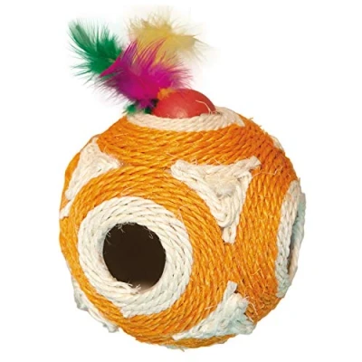 Sisal ball with holes and inner ball with feathers To satisfy cat hunting instinct Measurements: 11.5 cm.