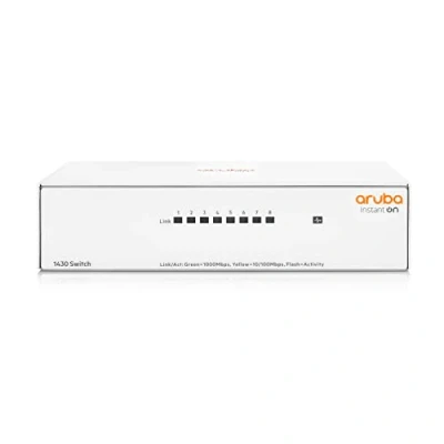 Daily Productivity The Instant On 1430 8G switch is an unmanaged plug-and-play layer 2 Gigabit Ethernet switch that provides simple, reliable, and cost-effective connectivity for small businesses and home offices. Class B certified for home office networks Easy Setup Unmanaged Simplicity: Fast, reliable Gigabit Ethernet speeds with no configuration or ongoing administration; install and forget. Designed for not easy, unmanaged plug and play, features fully automated features for a better user experience. Fanless design ensures quiet operation and supports energy-efficient Ethernet to save energy without sacrificing performance Convenient installation options: can be mounted on the table, on the wall and under the table. Features mounts for wall mounting with up or down ports and mounting holes at the bottom for under the table mounting External power supply Performance: has 8 active ports 8x Gigabit 10/100/1000 1G capable copper RJ45 connectors Manage your network with confidence with industry-leading lifetime limited warranty and appropriate support