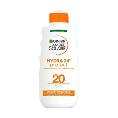 Ultra-hydrating sun protection for adults suitable for face and body, with SPF20 protection from UVB and UVA rays Skin instantly protected and hydrated for up to 24 hours, Water resistant Apply evenly to dry skin before sun exposure, Massage gently until completely absorbed, Apply several times throughout the day Lightweight texture for fast absorption, non-greasy, 100% recycled plastic bottle Check the PAO (Period After Opening) symbol indicating the expiration time of the product, after opening the package Contents: 1 x Garnier Ambre Solaire Hydra 24H Protect, Face and Body, Ultra-Moisturising All Day Long with Medium Protection SPF20, 200 ml