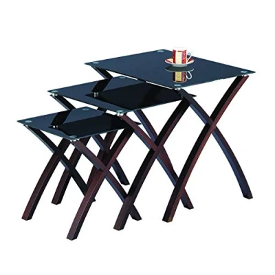 Modern 3-Piece Nesting table Set. Dimensions: L 52X40X50(H)cm / M 42X36X43(H)cm / S 32X32X36.5(H)cm. Material:Black Tempered Glass,Solid Wood in Wenge(Mahogany) Finish. Contemporary Design,Stylish solution to your home requirements. Provides three side tables, allowing you to scatter them around the room or combine them for a unique, multi-tiered unit.