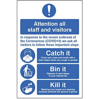 Safety sign to help display and advise of steps to take to mininmise the impact of coronavirus. Use as part of your workplace control measures during the COVID19 outbreak High quality print on glossy white, rigid PVC Waterproof - suitable for indoor and outdoor locations Lightweight with high impact strength, easily drilled for fixing Self-extinguishing material prevents the ignition of flames & flame spread