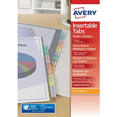Large printable tab inserts offer space for more lines of text and a professional finish Tab inserts can slide in and be removed easily Large printable tab inserts for more lines of text and a professional finish Durable polypropylene for long lasting use Save time with our easy-to-use template software; Avery Design and Print