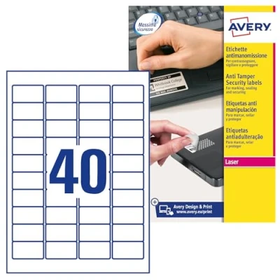 Protect your property with these unique peel and tamper proof labels from Avery If an attempt is made to remove the label, the material disintegrates, making removal virtually impossible and tampering immediately obvious Ideal for providing essential extra security, e.g. property labelling, security and safety labelling, inspection seals and calibration certificates These permanent labels are oil, dirt and UV resistant, water and tear proof, temperature resistant between -20ºC and +80ºC Save time with Avery free, easy-to-use template software; Avery design and print