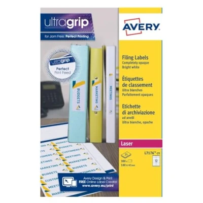 41 x 100 mm, permanent, 12 labels per sheet, 300 labels per pack Identify your lever arch files easily, adhesive strength for reliability Absolutely opaque - ideal for covering old inscriptions JamFree printing - special edges on the label sheet ensures no adhesive residue is left on your printer Save time with Avery's easy-to-use templates: Search Avery Design & Print to get started