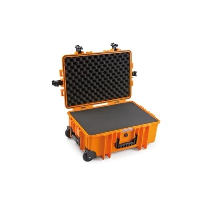 Polypropylene (PP), super stable and stackable, dustproof, waterproof, usable interior dimensions of empty case: 535 x 360 x 225 (175/50) mm. Temperature resistant from -30°C to +80°C, automatic pressure compensation valve, air permeable while repelling water. 5 layers of diced foam, 1 thin floor base, corrugated foam on lid. Two eyelets for padlocks (7 mm diameter). Rubber handle