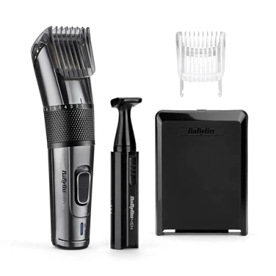 Babyliss Men's head hair and beard hair trimmer with carbon titanium blades (removable and washable) Operation with or without cable, 60 minutes runtime, 8 hours charging time 26 cutting lengths adjustable via rotating handle: 0.5 mm - 25 mm (in 1 mm increments) Includes 1 x mini trimmer, 1 x hair comb attachment, 1 x beard comb attachment and hard case