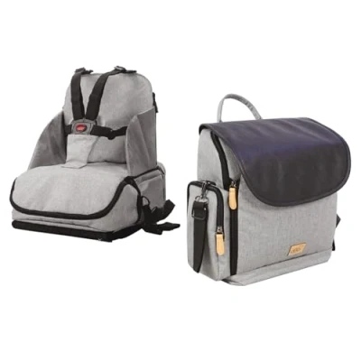 NOMADE - The ideal solution to take everything you need for the baby and sit safely at meals outdoors. Whether with friends, family or travelling, the booster seat allows your child to sit and transport food, snacks and nappies comfortably thanks to its many clever storage options. Universal – The booster seat fits all adult chairs with backrest. Simply attach the booster seat with the adjustable straps under the seat and to the backrest. Compact and robust – when folded, the booster seat can be easily transported in a backpack, as a shoulder strap, in the hand and can be attached to the pram thanks to its special fasteners. The durable and easy sponge clean polyester fabric is water resistant to repel stains and liquids. Dimensions when closed: 31 x 33 x 14 cm. SPACIOUS STORAGE The booster seat features a large spacious inner compartment with pockets under the seat. You can organize all your child's things: changes, eating, snacks and even some toys. 2 side pockets provide space for wet wipes and bottles. Under the booster seat there is a waterproof zip compartment that makes it easy to store wet or dirty clothes. Safe: for a secure fit of the child, the booster seat has a 5-point harness: crotch, stomach and shoulders. Use from 6 months when the child is sitting alone, up to a weight of 15 kg.