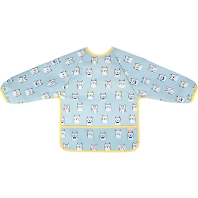 WATERPROOF AND FLEXIBLE. This long-sleeved bib is waterproof and adapts to your little one's movements thanks to its lightweight and flexible material. Ideal for eating comfortably! EASILY ADJUSTABLE: This long sleeve bib features a tie back strap that allows you to adjust it to all ages from 4 months to 3 years. OPTIMAL PROTECTION: Long sleeves with elastic cuffs and large central pocket will hold peas jumping off the plate. EASY TO CLEAN: The Badabulle long sleeve bib washes easily. One swipe in the washing machine is enough to leave it looking like new! 2 IN 1: Does your little one have an artist's soul? Our bib transforms into a small apron for painting shops!