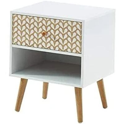 Set contents: 1 bedside table 1 storage drawer white and oak decor with patterns Solid wood legs Dimensions: L 40 x D 33 x H 49 cm