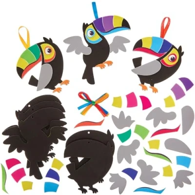 HANGING DECORATION This multipack of toucan decorations is a fun craft activity for creative kids. These complete packages contain all the pieces children need to make their own tropical birds that are perfect for decorating parties and celebrations. Kids Craft Kit: Boys and girls of all ages can make these easy to craft foam decorations. Children can peel and stick the self-adhesive foam pieces to create vibrant decorations. FOAM CRAFT DECORATION These colorful decorations do not require glue and are inconspicuous. Attach the decorations to the included ribbon to display at parties. Included in the pack: this pack contains 8 kits. Each kit includes foam templates, self-adhesive foam pieces for mixing and adjusting, and ribbons. Height: 11 cm - 13 cm. MADE BY EXPERTS - Baker Ross has been designing and supplying the best arts and crafts material as well as toys to schools, groups and parents for over 40 years. All products comply with general product safety regulations and give age recommendations where applicable.
