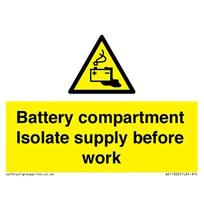 Battery compartment Isolate supply before work Sign 100x75mm A7L