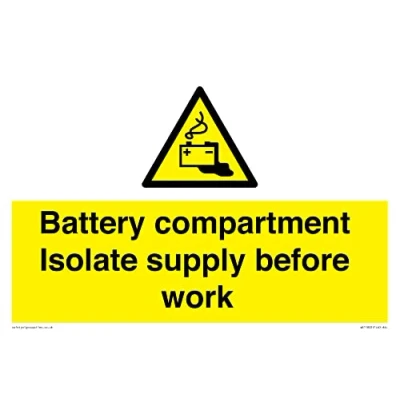 W026 : Battery charging This sign is made from vinyl high tack A stickier sticker. Uses a stronger adhesive to make it more suitable for plastic surfaces like Wheelie Bins or where the sticker might get rubbed. A4 landscape Sign Text: Battery compartment Isolate supply before work