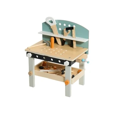 Classic wooden workbench in modern colour scheme for small young craftsmen Includes 1 workbench, 1 table clamp, 3 hole strips, 1 folding rule, 1 saw, 2 screwdrivers, 1 hammer, 6 screws, 6 nuts Rich accessories ensure long and intense fun Made from durable wood Dimensions: 45 x 27 x 49 cm, Manufacturer: Bayer Chic 2000