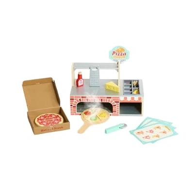 Pizzeria with storage, serving counter and pizza oven The set includes a cheese grater, a wooden pusher, a delivery box for pizza, a reusable menu for placing orders. Wooden topping included in the accessories (olives, mushrooms, onions, salami, tomato, cheese, bacon and peppers) Item dimensions: 40 x 22 x 23 cm, Manufacturer: Bayer Chic 2000