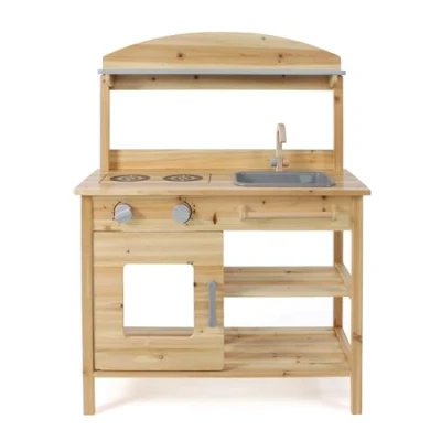 The sturdy outdoor play kitchen is made from solid, untreated fir wood It has a printed hob and a removable sink with tap Under the sink there is a shelf for storing accessories The rotating hob control knobs make realistic click sounds Dimensions: 68 x 30 x 84 cm; Height of worktop: 49.5 cm; Weight: 4.5 kg, Manufacturer: Bayer Chic 2000