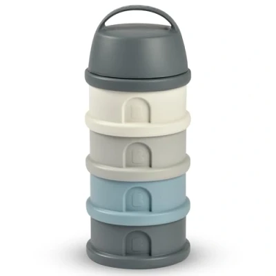 DOSING BOX: Milk powder measuring box, 4 stackable and interchangeable compartments LARGE CAPACITY: Holds up to 11 doses of milk powder (330ml) per compartment Airtight: 100% airtight: allows you to prepare the doses of milk powder in advance without the risk of leakage during transport Easy to use: funnel tip for pouring powder accurately EVOLUTIVE: the compartments can be used as snack boxes afterwards MADE IN FRANCE: product designed and manufactured in France ECO-DESIGNED PRODUCT: -28% plastic* and -20% CO2 emitted** On the product, compared to the old model with 4 compartments Based on a Life Cycle Analysis compared to the old model with 4 compartments