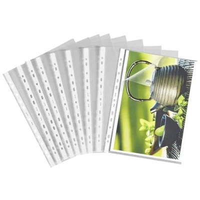 Colourless transparent case with smooth surface for storing important documents, documents or notes in A4 format Equipped with reinforced universal punched holes and therefore compatible with all standard binders and ring binders Opening on the top and side edges for easy filling; the grained hole edge prevents tears and guarantees the longevity of the film even with daily use Document case made from 100 micron thick indelible PP film and suitable for documents up to A4