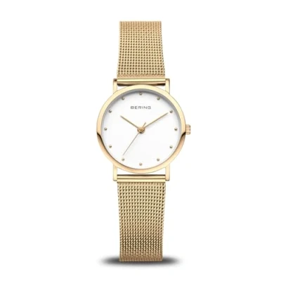 The classic collection. The women's watches focus on the essentials: precision in timeless aesthetics. Our watches are classic, puristic yet exciting and all our watches are inspired by the beauty of the Arctic Sapphire glass. The minimalist BERING women's watch is protected by a curved and very scratch-resistant sapphire glass with a white dial. Our sapphire glass is the third hardest transparent material after moissanite and diamonds Case and strap. The shiny case is made of high-quality, gold IPplated stainless steel. The women's watch is 9 mm flat and the diameter is 26 mm, the strap is made of high-quality, gold IPplated stainless steel. It is 175 mm long and 14 mm wide 3 ATM. The watch has a water resistance of up to 3 ATM. This means that it is protected against water splashes Gifts for women. Give great and unique watches and jewellery Bei BERING finden Sie für jeden ihre individuelles Geschenk Lass Sich von unseren Geschenkideen inspirieren und finde das perfekte BERING geschenke für sie