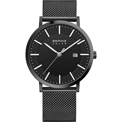 The solar collection. Place the watch in a light source with 3000 lux. After a few seconds, the watch starts charging and is ready to use (read the PDF "user manual" to see the instruction manual) Sapphire glass. The minimalist BERING men's watch is protected by a flat and very scratch-resistant sapphire glass with a black dial. Our sapphire crystal is the third hardest transparent material after moissanite and diamonds. Case and strap The shiny housing is made of high-quality, black IPplated stainless steel. The men's watch is 9 mm flat and the diameter is 39 mm. The strap is made of high-quality, black IPplated stainless steel. It is 185 mm long and 20 mm wide. 10 ATM water resistance. The watch has a water resistance of up to 10 ATM. This means that it is protected against rain, water splashes Gifts for men. Give great and unique watches and jewellery At BERING you will find your individual gift for everyone. Lass Dich von unseren Geschenkideen inspirieren und finde das perfekte BERING geschenke für ihn.