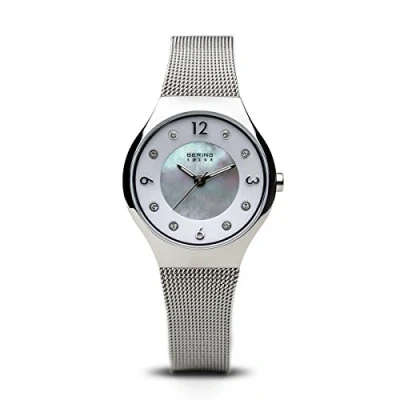 The solar collection. Place the watch in a light source with 3000 lux. After a few seconds, the watch starts charging and is ready to use (read the PDF "user manual" to see the instruction manual) Sapphire glass. The minimalist BERING women's watch is protected by a flat and very scratch-resistant sapphire glass with a white mother-of-pearl dials. Our sapphire crystal is the third hardest transparent material after moissanite and diamonds. Case and strap The shiny housing is made of high-quality, silver IPplated stainless steel. The women's watch is 7 mm flat and the diameter is 27 mm. The strap is made of high-quality, silver IPplated stainless steel. It is 167 mm long and 15 mm wide. 5 ATM. The watch has a water resistance of up to 5 ATM. This means it is protected against rain and water splashes. Gifts for women. Give great and unique watches and jewellery At BERING you will find your individual gift for everyone. Lass Dich von unseren Geschenkideen inspirieren und finde das perfekte BERING geschenke für sie.