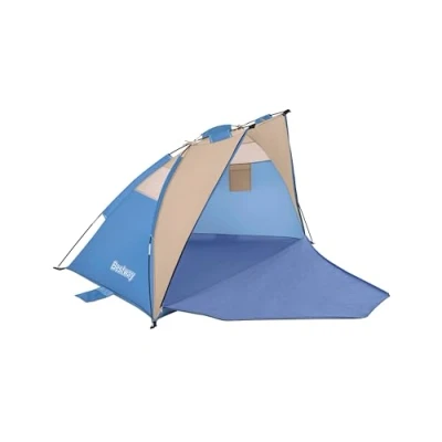 QUICK SETUP: Easily assemble this compact and comfortable beach tent in just 8 minutes for a relaxing day outdoors. DURABLE MATERIAL: Made with water-resistant and robust polyester fabric for added protection. GROUND PROTECTION: Includes a ground protection layer to shield the tent's bottom from humidity, water, and other elements. SECURE STRUCTURE: Equipped with sturdy fiberglass poles, a single entrance/exit, 4 stakes, and two sand pockets to ensure stability. AMPLE STORAGE: Features multiple interior pockets to store personal belongings, enhancing your beach or outdoor experience.