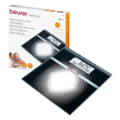 Diagnostic glass scales with brushed stainless steel electrodes Full diagnostics of body weight, body fat, body water, muscle ratio, bone mass, AMR & BMR Large LCD display with multi functions, with a digit size of 25mm Memory space for separate 10 users Tap on technology and automatic switch off