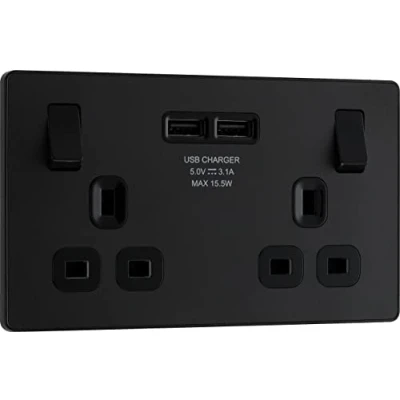 SLIM AND CONTEMPORARY DOUBLE SWITCHED POWER SOCKET WITH TWO USB CHARGING PORTS: From BG Electrical, the Evolve matt black double socket is ideal for modern interiors PART OF THE NEXUS RANGE FROM BG ELECTRICAL: It has been designed with angled in line colour coded terminals and backed out captive screws for ease of installation THE SLEEK AND SLIM EVOLVE DOUBLE SOCKET HAS A LOW PROFILE SCREWLESS FLAT PLATE: That clips on and off, ideal for re-decorating FOR FAST AND EASY INSTALLATION: The double socket fits a 25mm back box making it an ideal retro-fit replacement for existing sockets BG ELECTRICAL IS PART OF LUCECO PLC: They guarantee against faulty materials and workmanship for 25 years – giving you total peace of mind