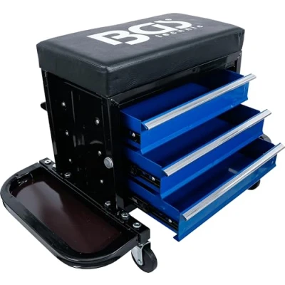 solid and mobile mechanics creeper | washable upholstery with storage levels for tools and small parts sturdy steel square tube construction | 2 side shelves, magnetic number of drawers: 3 | number of swivel castors: 4 | drawer load capacity: 5 kg per drawer castor diameter: 60 mm | max. capacity: 150 kg
