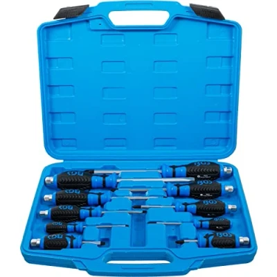 combined set | suitable for cross slot (PH) and slotted (SL) screws | partly with go-through blade and external hexagon drive for combined use with wrench | hexagonal blade with magnetic tips | non-slip, ergonomic soft grip for high power transmission size coding on the handle | material: chrome vanadium steel | handle type: 2 component handle scope of delivery: 1 screwdriver, cross slot PH0, blade length 75 mm (BGS 7910) | 1 screwdriver, blade with hexagon profile, cross slot PH1, blade length 75 mm (BGS 7911) | 1 screwdriver, blade with hexagon profile, cross slot PH2, blade length 38 mm (BGS 7912) | 1 screwdriver, blade with hexagon profile, cross slot PH2, blade length 100 mm (BGS 7913) | 1 screwdriver, blade with hexagon profile, cross slot PH3, blade length 150 mm (BGS 7914) 1 screwdriver, with external hexagon, slot SL 3.2 mm, blade length 75 mm (BGS 7916) | 1 screwdriver, with external hexagon, slot SL 5 mm, blade length 75 mm (BGS 7917) | 1 screwdriver, with external hexagon, slot SL 6 mm, blade length 38 mm (BGS 7918) | 1 screwdriver, with external hexagon, slot SL 6 mm, blade length 100 mm (BGS 7919) | 1 screwdriver, with external hexagon, slot SL 8 mm, blade length 150 mm (BGS 7920)