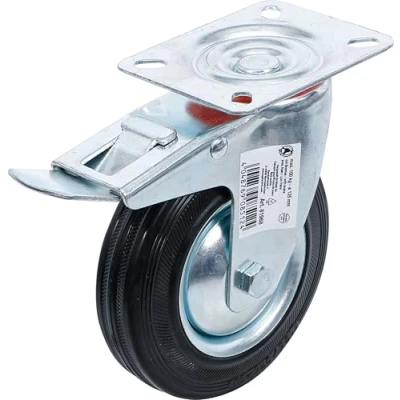 For indoor and outdoor use | Enables both smooth and quiet operation on many types of flooring Suitable for assembly trolleys, scooters, transport trolleys and garbage containers. Made of galvanised sheet steel With stop brake | With ball bearings | Dust sleeve | 360° rotation around its own axis Application temperature: -10 - 50°C | Wheel diameter: 125 mm | Width of wheels: 36 mm | Total height: 150 mm Hole size: 8 x 13 mm | Mounting hole spacing: 75 x 55 mm | Screw-in base dimensions: 100 x 80 mm | Maximum load capacity 100 kg