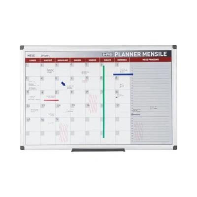 Monthly planner in Italian High quality magnetic dry wipe surface Writing and easy cleaning. Classic aluminium frame, 20 mm. Supplied with pen, tray pen holder, magnets and wall mounting kit.