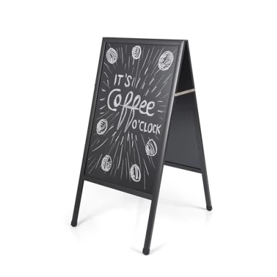 Ideal to display information inside or outside a store, pub, café, hotel and the like. Promote your business and services in public spaces with this A-frame double-sided chalkboard. The double-sided black surfaces provide large writing spaces and are easy to clean. The wooden black structure ensures sturdiness and a sleek-looking design. Its portable and foldable so that it can be stored when not in use. Ideal to display information inside or outside a store, pub, café, hotel and the like. Promote your business and services in public spaces with this A-frame double-sided chalkboard. The double-sided black surfaces provide large writing spaces and are easy to clean. The wooden black structure ensures sturdiness and a sleek-looking design. Its portable and foldable so that it can be stored when not in use.