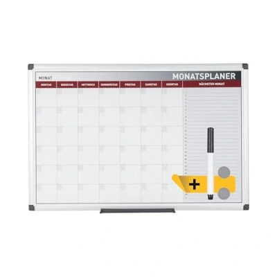 Aluminium frame Plan a week in advance: use your time more efficiently High quality magnetic dry erase surface Easy to write on and clean Monthly planner comes with marker, pen tray, magnets and wall mounting kit
