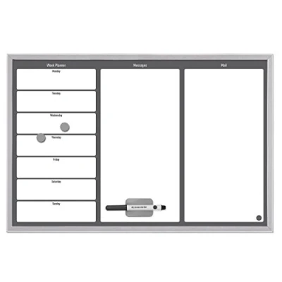 60 x 40 cm planner with MDF frame in grey Ideal for organising tasks, messages and notes Dry erase magnetic surface allows use of magnets Included are 1 marker, 1 blackboard cleaner, 2 magnets and 1 wall mounting kit