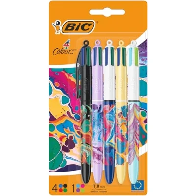 What You’ll Get - 1 pack of BIC 4 Colours with leaf prints and 5 ballpoint pens featuring multi colour pens with green, blue, black, and red biro pen options Use - Write with a BIC pen that has four ink colours in one when you use this simple yet reliable multicoloured pen, providing a solution we need everyday Durable Multicoloured Pen - Easily switch between different coloured ink using the retractable biro pen, featuring a medium 1.0mm point with a refillable ink cartridge that writes for 8km High Quality Colour Pens - These BIC pens are built to last and certified by the NF Environmental for the utmost in eco credentials Trusted Company - BIC was founded in 1945 in France and remains a world-leading brand of biro pens, including BIC 4 Colours pens, which have multiple colours, are easy to hold, and won’t roll off surfaces