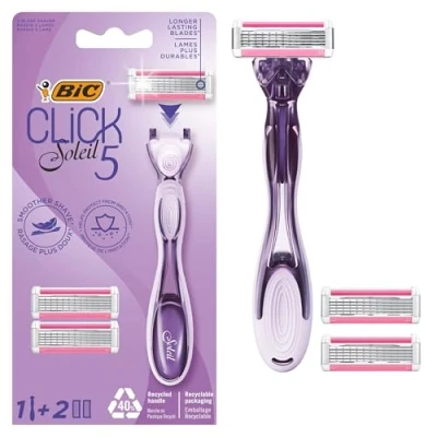 SMOOTH SHAVE: This razor has 5 movable and durable blades for an even softer close shave RECHARGEABLE RAZOR 5 BLADES: This rechargeable razor helps protect against irritation thanks to its soothing lubricating strip and swivel head PRECISE SHAVING: Its lubricating strip is enriched with aloe vera and coconut milk. Its pivoting head glides over the skin and conforms to the curves of your body for a precise shave every time. RECYCLABLE PACKAGING: It comes in 100% recyclable packaging made from 80% recycled materials Ergonomic handle: this BIC Click 5 Soleil all-in-one rechargeable shaver for women comes in a kit with 1 handle and 2 blade refills