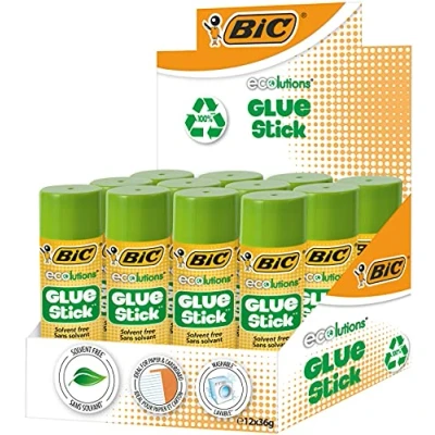 BIC Ecolutions Glue sticks are made from recycled materials They are solvent free so perfect for use by little people. The glue is also washable from skin and most fabrics BIC Ecolutions Glue sticks are suitable for use on paper, cardboard and even photos so are ideal for all arts and craft projects They have an easy and clean application as the glue can be twisted up to provide just as much glue as you need The glue sticks come in four different sizes, 8g, 15g, 21g and 36g