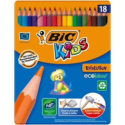 Eco-friendly colouring pencils, available in 18 bright colours in a durable metal tin. Highlight the beautiful designs Their lead is extra resistant, easy to sharpen, highly pigmented and has a high coverage They are made of synthetic resin and wood-free. For a better chew resistant body and splinter free in case of breakage Their hexagonal body is easy to grip and will not roll on the table: they are perfectly suitable for children aged 5 and up Made with 35% recycled material, these 18 BIC Kids Evolution ECOlutions pencils have been awarded the NF Environnement label