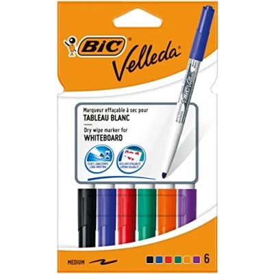 The fixed bullet nib never gets bent out of shape or pushed in while using pressure on whiteboards Excellent erasability that makes rubbing out errors and rewriting quick and easy, even after few days Make your thoughts truly stand out with a palette of 6 bold colours: black, blue, red, green, yellow and orange The round marker barrel is designed for easy grip and smooth writing Bright colourful presentations are a cinch with these BIC Velleda 1741 dry erase markers. Available in 6 dazzling bold colours (black, blue, red, green, orange and purple) with pigmented ink that's easy to read on whiteboards and erases in a single wipe. This wallet contains 6 whiteboard pens in black, blue, red, green, purple and orange (one of each). Developed especially for offices and schools that use BIC Velleda whiteboards, the durable medium-nib dry erase pens provide excellent precision. Because they are shaped like a marker, they are easy to handle and offer a comfortable grip. The 4.5 mm acrylic bullet nib creates 1.4 mm medium thick lines. And you can be sure of the quality because these dry erase pens were made in BIC's own plants in Europe backed by the company’s unmatched expertise. Did you know that BIC Velleda is a BIC brand? BIC acquired Velleda to add an entirely new dry erase line to its range of writing supplies, which now includes pens, slates and whiteboards.