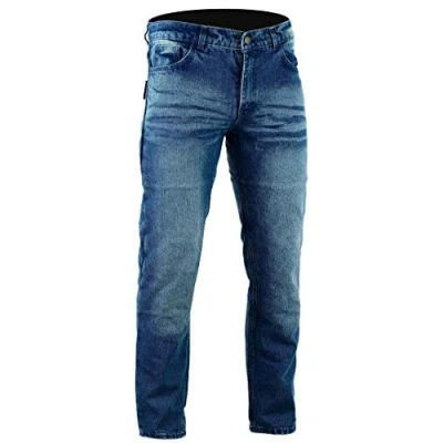 Classic denim in stone washed - regular loose straight leg, comfortable heavy denim & 240gsm Kevlar. PERFECT FOR THE BOOT - Machine washable and dry. Dual position knee pads, high or low pockets, hip protectors are also included. The knee protection is 1621-1. Both knees and hips are removable. Dupont Kevlar Aramid Fibres Protective Insert in Striking Surface - 100% Pure Undiluted Kevlar. DuPontTM and Kevlar are registered trademarks of E.I. Du Pont de Nemours and Company 100% polyester antibacterial fixed wick mesh lining "our jeans edge that extra mile"