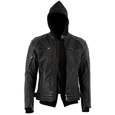 Combination of the best material mix of waxed nubuck cowhide black milled and leather. Cosy and warm in winter and zip hoodie for summer. The removable hoodie is sleeve less (vest/cut style) and ideal for wearing in summer on its own. Pack of 5 CE-1621-1 elbow and shoulders protectors and soft back protector. Full-length YKK brass zip vents and brass pockets zips in jacket.