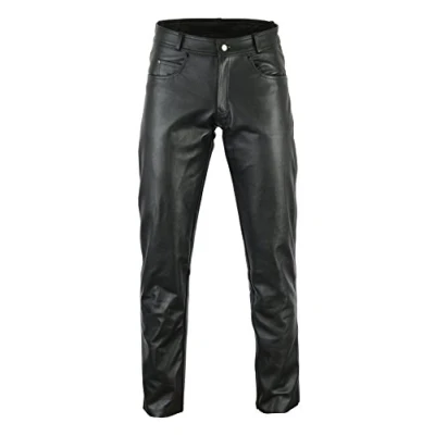 HALF WAISTBAND Please measure on the back of your best fitting jeans and compare our half size chart in the product description below. Bikers Rock & Roll leather jean comes with unfine 33" inseam but remember CowHide leather is a natural material and can be easily cut to the perfect leg size. Classic five-pocket style with zip and snap waistband. Extra strong & extra soft cowhide leather jeans.