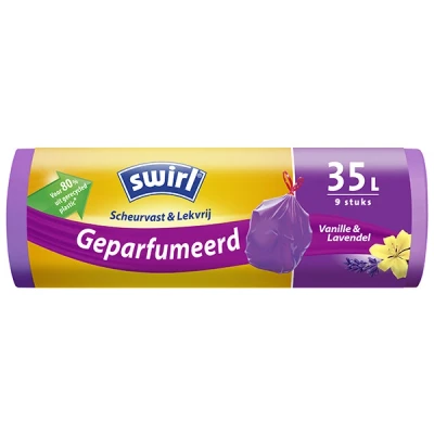 AmazonSwirl Scented bin liners, vanilla lavender, 35 L, tear-resistant and leakproof Swirl Fragrance bin liner 35 l · with pleasant vanilla lavender scent · Drawstring for knotting and carrying · With tear-resistant 3-layer film · With liquid-tight base · Made from 80% recycled plastic.